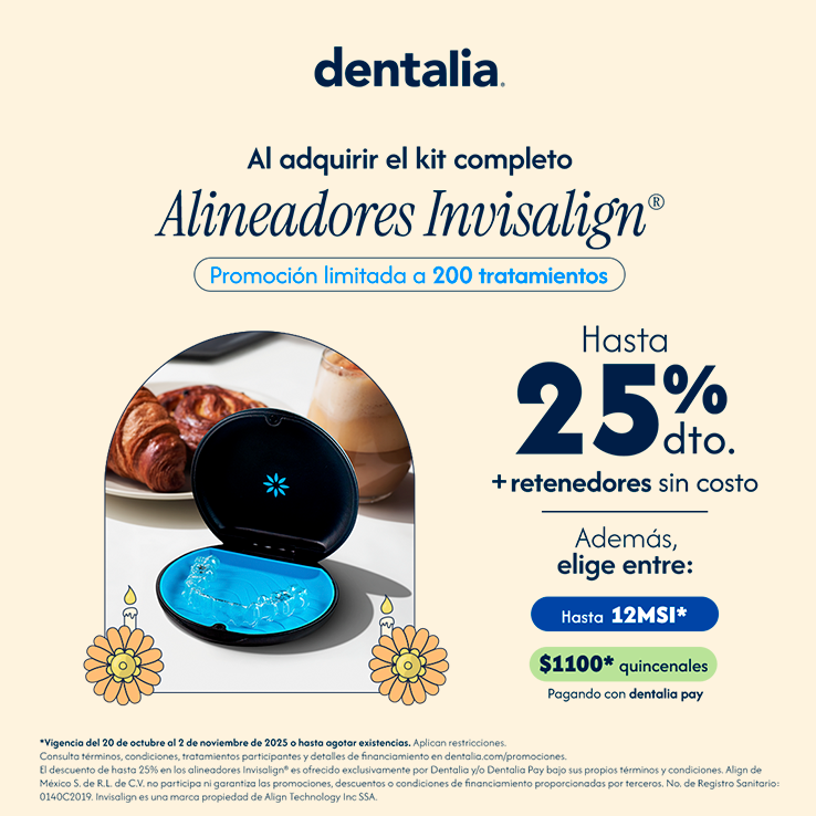 El descuento promocional aplica en los siguientes kits de ortodoncia: 1) CLEAR CORRECT MINI, 2) CLEAR CORRECT ONE, 3) CLEAR CORRECT TWO o 4) CLEAR CORRECT UNLIMITED. Cada Kit incluye las siguientes etapas, las cuales pueden cambiar dependiendo del tratamiento diagnosticado: ORTODONCIA CON ALINEADORES SESIÓN INICIAL (una sesión), ORTODONCIA CON ALINEADORES CITA DE AVANCE Y CONTROL (la cantidad de citas de avance y control depende del tratamiento pagado, consulta detalles en clínica), ORTODONCIA CON ALINEADORES SESIÓN FINAL (una sesión) y ORTODONCIA CON ALINEADORES CITA REFINAMIENTO (la cantidad depende del tratamiento pagado). El descuento promocional para pacientes que cuentan con membresía dentalia aplica de la siguiente forma: 25% con pago de contado, 20% con hasta 9MSI. El descuento promocional para pacientes que cuentan con algún plan dental aplica de la siguiente forma: 20% con pago de contado, 15% con hasta 9MSI. El descuento promocional para pacientes que no cuentan con algún plan dental o membresía dentalia aplica de la siguiente forma: 20% con pago de contado, 15% con hasta 9MSI. El descuento no aplica en aquellos tratamientos que tengan un descuento de plan mayor al 10%. Descuento válido únicamente para compras realizadas en clínicas que operan bajo la marca dentalia® durante el periodo de vigencia de la promoción; consulta de listado de clínicas en https://dentalia.com/clinicas. El precio de los tratamientos señalados puede variar de acuerdo con la ciudad. El descuento promocional aplica al pagar el total del tratamiento señalado en estos términos. Consulta el detalle de tarjetas participantes, condiciones y programas de financiamiento en clínica. El descuento no aplica con otras promociones. Promoción válida hasta agotar existencias. Tratamiento sujeto a valoración médica y viabilidad. Vigencia del 6 al 19 de octubre de 2025.