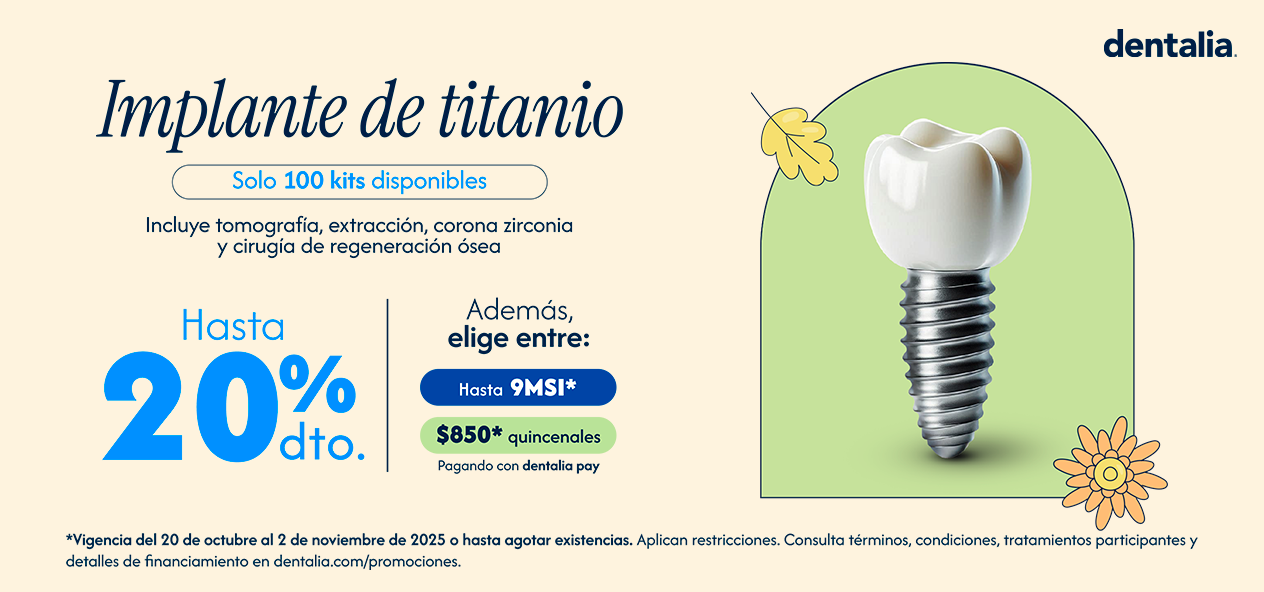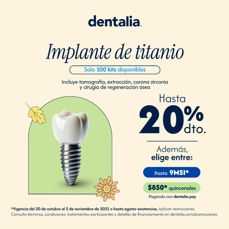 El descuento promocional aplica en los siguientes kits de implante: 1) IMPLANTE DENTAL, 2) EXTRACCIÓN CON PRESERVACIÓN DE ALVEOLO CON IMPLANTE DENTAL. El kit 1 incluye los siguientes tratamientos, los cuales pueden cambiar dependiendo del diagnóstico clínico: CONSULTA TOMOGRAFÍA, IMPLANTE COLOCACIÓN NEODENT, CORONA SOBRE IMPLANTE EN ZIRCONIA. El kit 2 incluye los siguientes tratamientos, los cuales pueden cambiar dependiendo del diagnóstico clínico: CONSULTA TOMOGRAFÍA, EXTRACCIÓN COMPLEJA, CIRUGÍA DE REGENERACIÓN ÓSEA PRESERVACIÓN DE ALVEOLO, IMPLANTE COLOCACIÓN NEODENT, CORONA SOBRE IMPLANTE EN ZIRCONIA. El descuento promocional para pacientes que cuentan con membresía dentalia aplica de la siguiente forma: 15% con pago de contado, 10% con hasta 9MSI. El descuento promocional para pacientes que cuentan con algún plan dental aplica de la siguiente forma: 10% con pago de contado, 5% con hasta 9MSI. El descuento promocional para pacientes que no cuentan con algún plan dental o membresía dentalia aplica de la siguiente forma: 10% con pago de contado, 5% con hasta 9MSI. El descuento no aplica en aquellos tratamientos que tengan un descuento de plan mayor al 10%. Descuento válido únicamente para compras realizadas en clínicas que operan bajo la marca dentalia® durante el periodo de vigencia de la promoción; consulta de listado de clínicas en https://dentalia.com/clinicas. El precio de los tratamientos señalados puede variar de acuerdo con la ciudad. El descuento promocional aplica al pagar el total del tratamiento señalado en estos términos. Consulta el detalle de tarjetas participantes, condiciones y programas de financiamiento en clínica. El descuento no aplica con otras promociones. Promoción válida hasta agotar existencias. Tratamiento sujeto a valoración médica y viabilidad. Aplican restricciones en financiamiento a meses sin intereses. El monto mínimo para financiamiento a 9 MSI es de $15,000. Vigencia del 6 al 19 de octubre de 2025.