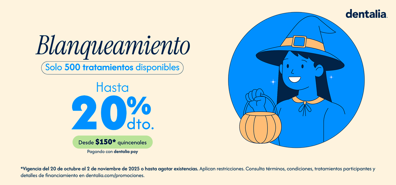 El descuento promocional aplica en los siguientes tratamientos: BLANQUEAMIENTO EN CONSULTORIO OPALESCENCE BOOST. El descuento promocional para pacientes que cuentan con membresía dentalia aplica de la siguiente forma: 20% con pago de contado. El descuento promocional para pacientes que cuentan con algún plan dental aplica de la siguiente forma: 15% con pago de contado. El descuento promocional para pacientes que no cuentan con algún plan dental o membresía dentalia aplica de la siguiente forma: 15% con pago de contado. El descuento no aplica en aquellos tratamientos que tengan un descuento de plan mayor al 10%. Descuento válido únicamente para compras realizadas en clínicas que operan bajo la marca dentalia® durante el periodo de vigencia de la promoción; consulta de listado de clínicas en https://dentalia.com/clinicas. El precio de los tratamientos señalados puede variar de acuerdo con la ciudad. El descuento promocional aplica al pagar el total del tratamiento señalado en estos términos. Consulta el detalle de tarjetas participantes, condiciones y programas de financiamiento en clínica. El descuento no aplica con otras promociones. Promoción válida hasta agotar existencias. Tratamiento sujeto a valoración médica y viabilidad. Aplican restricciones en financiamiento a meses sin intereses. Vigencia del 6 al 19 de octubre de 2025.El descuento promocional aplica en los siguientes tratamientos: BLANQUEAMIENTO EN CONSULTORIO ZOOM. El descuento promocional para pacientes que cuentan con membresía dentalia aplica de la siguiente forma: 15% con pago de contado. El descuento promocional para pacientes que cuentan con algún plan dental aplica de la siguiente forma: 10% con pago de contado. El descuento promocional para pacientes que no cuentan con algún plan dental o membresía dentalia aplica de la siguiente forma: 10% con pago de contado. El descuento no aplica en aquellos tratamientos que tengan un descuento de plan mayor al 10%. Descuento válido únicamente para compras realizadas en clínicas que operan bajo la marca dentalia® durante el periodo de vigencia de la promoción; consulta de listado de clínicas en https://dentalia.com/clinicas. El precio de los tratamientos señalados puede variar de acuerdo con la ciudad. El descuento promocional aplica al pagar el total del tratamiento señalado en estos términos. Consulta el detalle de tarjetas participantes, condiciones y programas de financiamiento en clínica. El descuento no aplica con otras promociones. Promoción válida hasta agotar existencias. Tratamiento sujeto a valoración médica y viabilidad. Aplican restricciones en financiamiento a meses sin intereses. Vigencia del 6 al 19 de octubre de 2025.