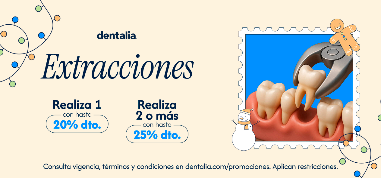 El descuento promocional aplica en los siguientes tratamientos: EXTRACCIÓN COMPLEJA, EXTRACCIÓN SIMPLE, EXTRACCIÓN TERCER MOLAR, IMPLANTE EXTRACCIÓN, EXTRACCIÓN INFANTIL. Descuentos aplicables: a) En el pago de un solo tratamiento de extracción: a.1) El descuento promocional para pacientes que cuentan con membresía dentalia aplica de la siguiente forma: 20% con pago de contado; a.2) El descuento promocional para pacientes que cuentan con algún plan dental aplica de la siguiente forma: 15% con pago de contado; a.3) El descuento promocional para pacientes que no cuentan con algún plan dental o membresía dentalia aplica de la siguiente forma: 15% con pago de contado; b) En el pago de dos o más tratamientos de extracción: b.1) El descuento promocional para pacientes que cuentan con membresía dentalia aplica de la siguiente forma: 25% con pago de contado; b.2) El descuento promocional para pacientes que cuentan con algún plan dental aplica de la siguiente forma: 20% con pago de contado; b.3) El descuento promocional para pacientes que no cuentan con algún plan dental o membresía dentalia aplica de la siguiente forma: 20% con pago de contado. El descuento no aplica en aquellos tratamientos que tengan un descuento de plan mayor al 10%. Descuento válido únicamente para compras realizadas en clínicas que operan bajo la marca dentalia® durante el periodo de vigencia de la promoción; consulta de listado de clínicas en https://dentalia.com/clinicas. El precio de los tratamientos señalados puede variar de acuerdo con la ciudad. El descuento promocional aplica al pagar el total del tratamiento señalado en estos términos. Consulta el detalle de tarjetas participantes, condiciones y programas de financiamiento en clínica. El descuento no aplica con otras promociones. Promoción válida hasta agotar existencias. Tratamiento sujeto a valoración médica y viabilidad. Aplican restricciones en financiamiento a meses sin intereses. Vigencia del 1 al 10 de diciembre de 2025.