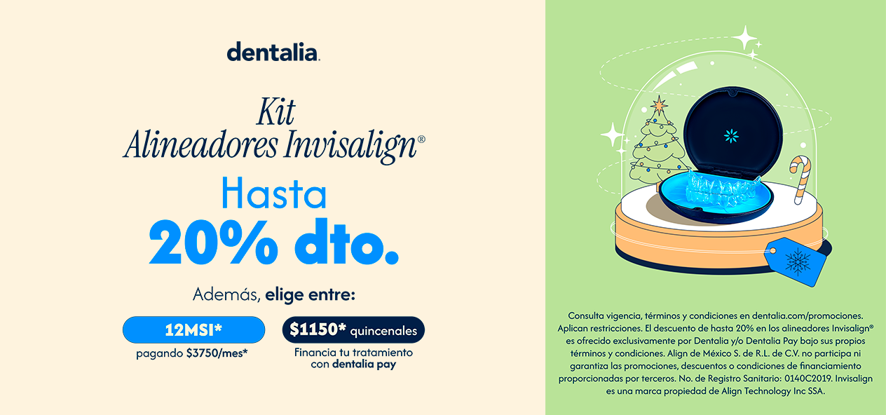 El descuento promocional aplica en los siguientes kits de ortodoncia: 1) INVISALIGN LITE, 2) INVISALIGN MODERATE o 3) INVISALIGN COMPREHENSIVE. Cada Kit incluye las siguientes etapas, las cuales pueden cambiar dependiendo del tratamiento diagnosticado: ORTODONCIA CON ALINEADORES SESIÓN INICIAL (una sesión), ORTODONCIA CON ALINEADORES CITA DE AVANCE Y CONTROL (la cantidad de citas de avance y control depende del tratamiento pagado), ORTODONCIA CON ALINEADORES SESIÓN FINAL (una sesión) y ORTODONCIA CON ALINEADORES CITA REFINAMIENTO (la cantidad depende del tratamiento pagado. El descuento promocional para pacientes que cuentan con membresía dentalia aplica de la siguiente forma: 20% con pago de contado, 15% con hasta 12MSI. El descuento promocional para pacientes que cuentan con algún plan dental aplica de la siguiente forma: 15% con pago de contado, 10% con hasta 12MSI. El descuento promocional para pacientes que no cuentan con algún plan dental o membresía dentalia aplica de la siguiente forma: 15% con pago de contado, 10% con hasta 12MSI. El descuento no aplica en aquellos tratamientos que tengan un descuento de plan mayor al 10%. Descuento válido únicamente para compras realizadas en clínicas que operan bajo la marca dentalia® durante el periodo de vigencia de la promoción; consulta de listado de clínicas en https://dentalia.com/clinicas. El precio de los tratamientos señalados puede variar de acuerdo con la ciudad. El descuento promocional aplica al pagar el total del tratamiento señalado en estos términos. Consulta el detalle de tarjetas participantes, condiciones y programas de financiamiento en clínica. El descuento no aplica con otras promociones. Promoción válida hasta agotar existencias. Tratamiento sujeto a valoración médica y viabilidad. Aplican restricciones en financiamiento a meses sin intereses. El descuento en los alineadores Invisalign® es ofrecido exclusivamente por Dentalia y/o Dentalia Pay bajo sus propios términos y condiciones. Align de México S. de R.L. de C.V. no participa ni garantiza las promociones, descuentos o condiciones de financiamiento proporcionadas por terceros. No. de Registro Sanitario: 0140C2019. Invisalign es una marca propiedad de Align Technology Inc SSA. Vigencia del 1 al 10 de diciembre de 2025.