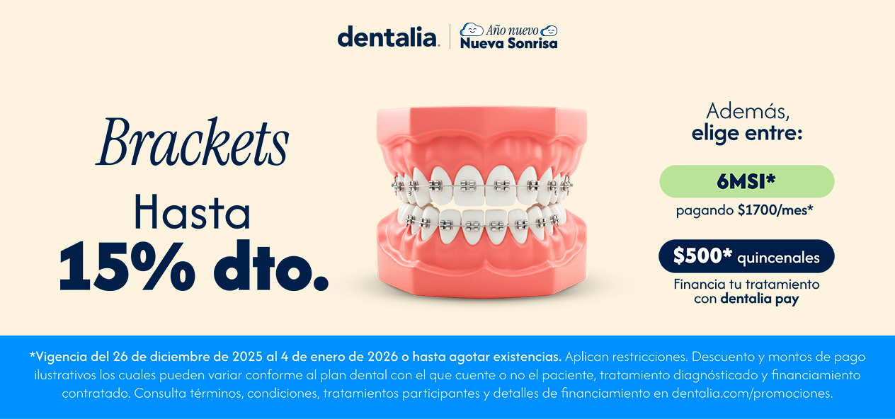 El descuento promocional aplica en los siguientes kits o sesión inicial de ortodoncia con brackets: BRACKETS AUTOLIGADOS ESTETICOS SENCILLOS, BRACKETS AUTOLIGADOS ESTETICOS MODERADOS, BRACKETS AUTOLIGADOS ESTETICOS COMPLEJOS, BRACKETS AUTOLIGADOS METÁLICOS SENCILLOS, BRACKETS AUTOLIGADOS METÁLICOS MODERADOS, BRACKETS AUTOLIGADOS METÁLICOS COMPLEJOS, BRACKETS CONVENCIONALES ESTÉTICOS SENCILLOS, BRACKETS CONVENCIONALES ESTÉTICOS MODERADOS, BRACKETS CONVENCIONALES ESTÉTICOS COMPLEJOS, BRACKETS CONVENCIONALES METÁLICOS SENCILLOS, BRACKETS CONVENCIONALES METÁLICOS MODERADOS o BRACKETS CONVENCIONALES METÁLICOS COMPLEJOS. Cada Kit de Brackets incluye las siguientes etapas, las cuales pueden cambiar dependiendo del tratamiento pagado: ORTODONCIA CON BRACKETS SESIÓN INICIAL (una sesión de colocación), ORTODONCIA CON BRACKETS CITA DE AVANCE Y CONTROL (la cantidad depende del tratamiento pagado), ORTODONCIA CON BRACKETS SESIÓN FINAL (una sesión). El descuento promocional para pacientes que cuentan con membresía dentalia aplica de la siguiente forma: 15% con hasta 6MSI. El descuento promocional para pacientes que cuentan con algún plan dental aplica de la siguiente forma: 10% con hasta 6MSI. El descuento promocional para pacientes que no cuentan con algún plan dental o membresía dentalia aplica de la siguiente forma: 10% con hasta 6MSI. El descuento no aplica en aquellos tratamientos que tengan un descuento de plan mayor al 10%. Descuento válido únicamente para compras realizadas en clínicas que operan bajo la marca dentalia® durante el periodo de vigencia de la promoción; consulta de listado de clínicas en https://dentalia.com/clinicas. El precio de los tratamientos señalados puede variar de acuerdo con la ciudad. El descuento promocional aplica al pagar el total del tratamiento señalado en estos términos. Consulta el detalle de tarjetas participantes, condiciones y programas de financiamiento en clínica. El descuento no aplica con otras promociones. Promoción válida hasta agotar existencias. Tratamiento sujeto a valoración médica y viabilidad. Aplican restricciones en financiamiento a meses sin intereses. Del 26 de diciembre de 2025 al 4 de enero de 2026.