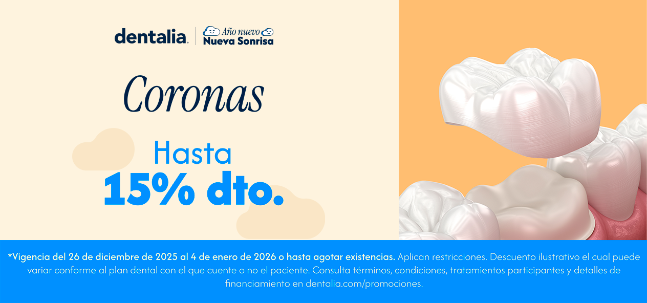 El descuento promocional aplica en los siguientes tratamientos: CORONA DISILICATO DE LITIO, CORONA METAL, CORONA METAL PORCELANA, CORONA SOBRE IMPLANTE EN DISILICATO DE LITIO, CORONA SOBRE IMPLANTE EN ZIRCONIA, CORONA ZIRCONIA, CORONA INFANTIL ACERO CROMO, CORONA INFANTIL CELULOIDE, CORONA INFANTIL FRENTE ESTÉTICO. El descuento promocional para pacientes que cuentan con membresía dentalia aplica de la siguiente forma: 15%. El descuento promocional para pacientes que cuentan con algún plan dental aplica de la siguiente forma: 10%. El descuento promocional para pacientes que no cuentan con algún plan dental o membresía dentalia aplica de la siguiente forma: 10%. El descuento no aplica en aquellos tratamientos que tengan un descuento de plan mayor al 10%. Descuento válido únicamente para compras realizadas en clínicas que operan bajo la marca dentalia® durante el periodo de vigencia de la promoción; consulta de listado de clínicas en https://dentalia.com/clinicas. El precio de los tratamientos señalados puede variar de acuerdo con la ciudad. El descuento promocional aplica al pagar el total del tratamiento señalado en estos términos. Consulta el detalle de tarjetas participantes, condiciones y programas de financiamiento en clínica. El descuento no aplica con otras promociones. Promoción válida hasta agotar existencias. Tratamiento sujeto a valoración médica y viabilidad. Aplican restricciones en financiamiento a meses sin intereses. Del 26 de diciembre de 2025 al 4 de enero de 2026.